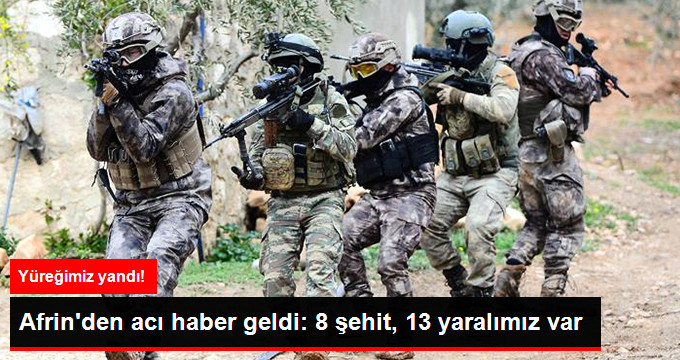 Afrin operasyonunda yaşanan sıcak çatışma sonrası TSK’dan açıklama geldi. Buna göre 8 askerimiz şehit düşerken 13 de yaralımız var.